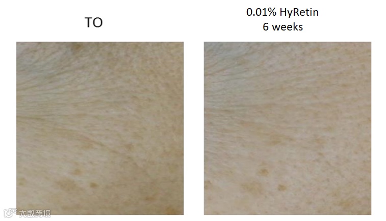 此外,也有实验数据证明使用0.01% HyRetin六周后真皮密度提高10%,真皮乳头数量增加48 %,弹性提高34%,皮肤质地(光泽度/粗糙度)改善43%,水合增加7%。