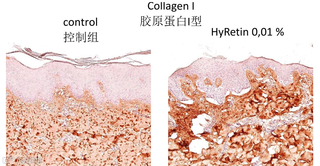 皮肤外植体+100µg/ml HyRetin,培育24h;采用免疫组织化学染色法分析胶原蛋白1型(COL1)表达。