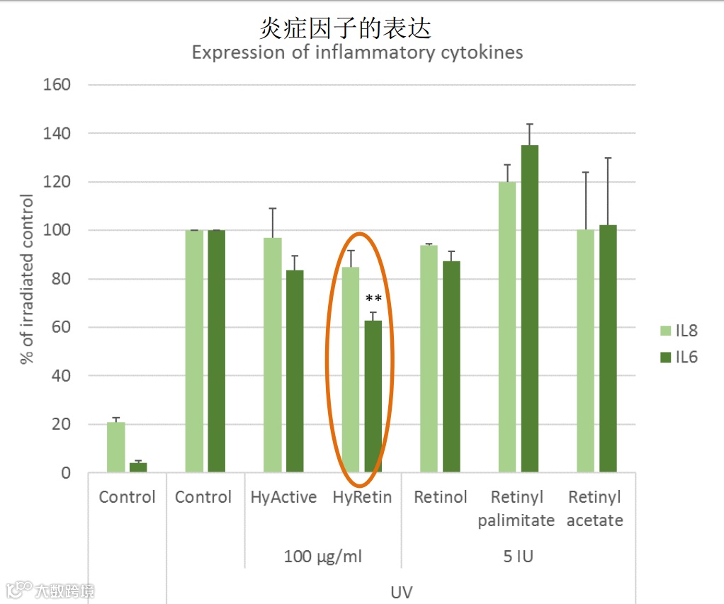实验证明0.01% HyRetinn极大地减少了由紫外辐射诱导的促炎性白细胞介素的表达,功效优于市面上的其他视黄醇。