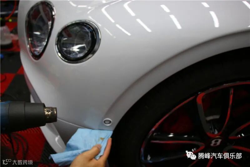 宾利GT叶子板贴膜进入收尾,收边时预留的包边,需要配合烤枪进行加温处理,这样可以让包边更为牢固,防止日后的使用发生翘边等情况发生。