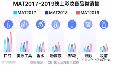 从上图这份来自CBNData消费数据统计的情况来看,2017-2019年线上彩妆各品类销售均有上涨,其中口红、美妆工具、粉底液的销售涨幅明显。意味着越来越多的消费者通过基础彩妆产品提升自身形象。