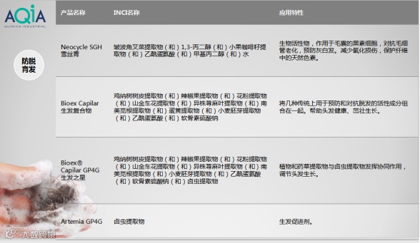 家化化学巴西AQIA专业研究发品原料35年,与国际多家知名品牌如AAK,爱西美,联合利华,高露洁等达成战略合作。针对防脱育发方面,巴西AQIA推出不同机理可以解决不同成因导致的脱发问题。