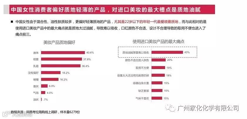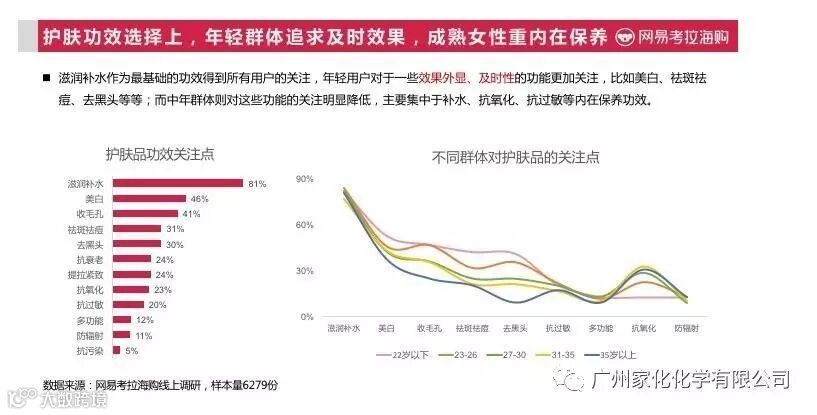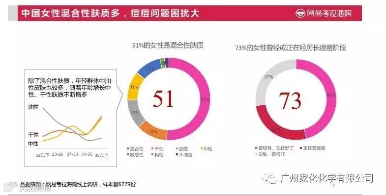 《2017进口美妆趋势报告》显示,中国女性半数为混合型肤质,而在年轻群体中油性皮肤也较多,随着年龄增长中性、干性肤质不断增多,将近有7成以上女性消费者曾经或正在经历长痘痘阶段。这也导致了中国女性消费者,在对美妆类商品的选择时,更注重其功效成分。