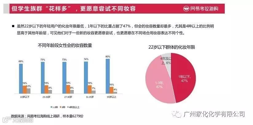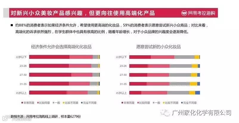 与消费现状形成强烈反差的是,88%的中国女性消费者在经济条件允许的情况下,希望使用更高端的化妆品,59%的消费者表示愿意尝试新兴小众商品;对比来看,高端化的诉求依然强烈,在学生群体中也具有很高的比例。