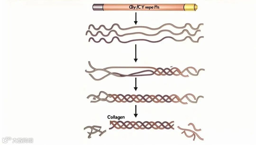 胶原蛋白的基础结构由三条多肽链以右手螺旋方式缠绕形成,其氨基酸序列呈现特征性(Gly-X-Y)n重复单元(X、Y多为脯氨酸与羟脯氨酸)。这种精密的空间构象赋予其独特物理特性:单位拉伸强度达钢材1.5倍,同时构成生物识别的结构基础。
