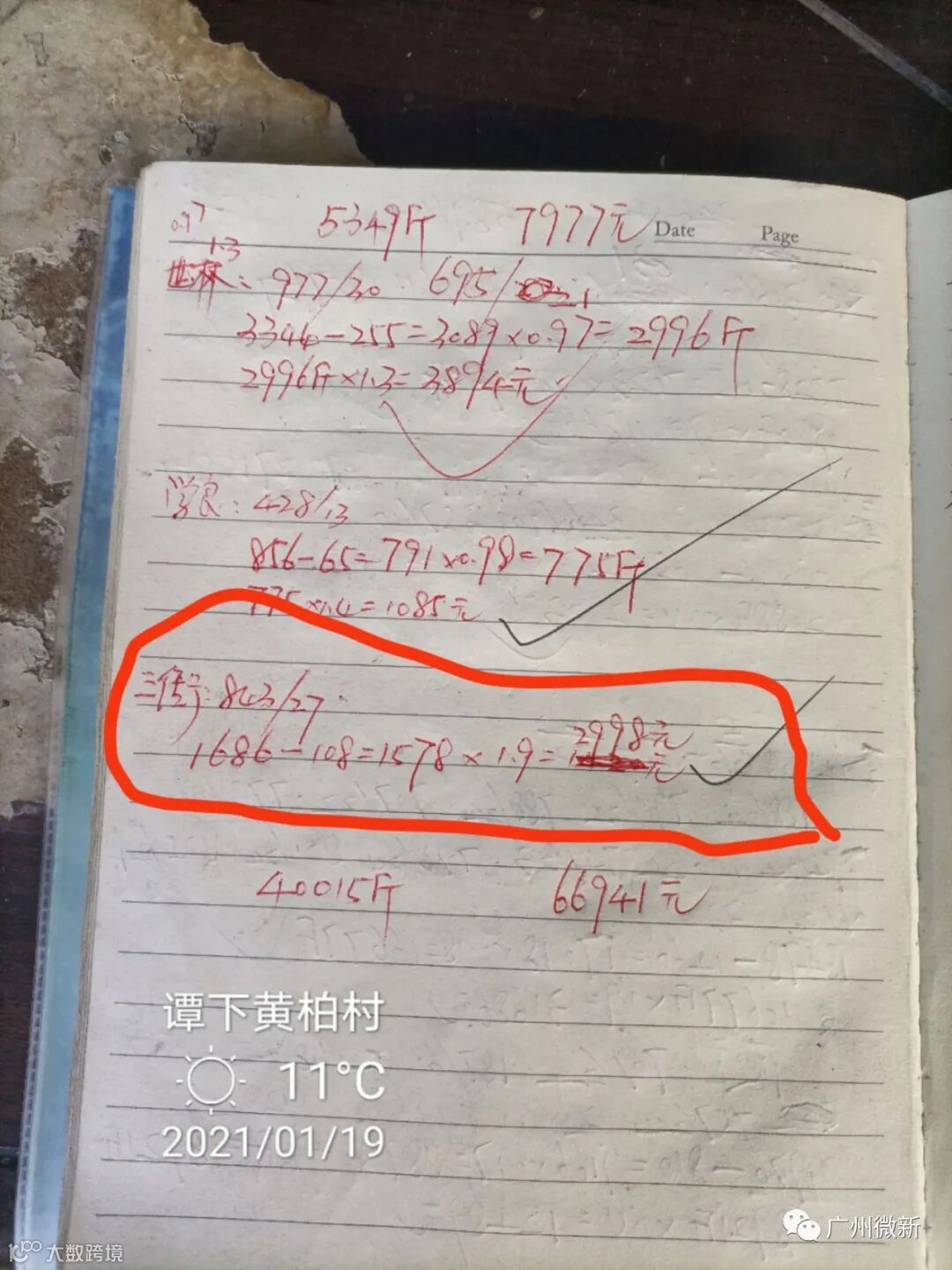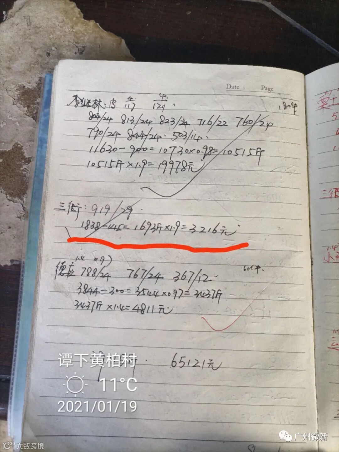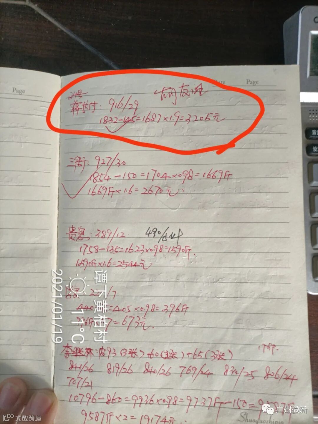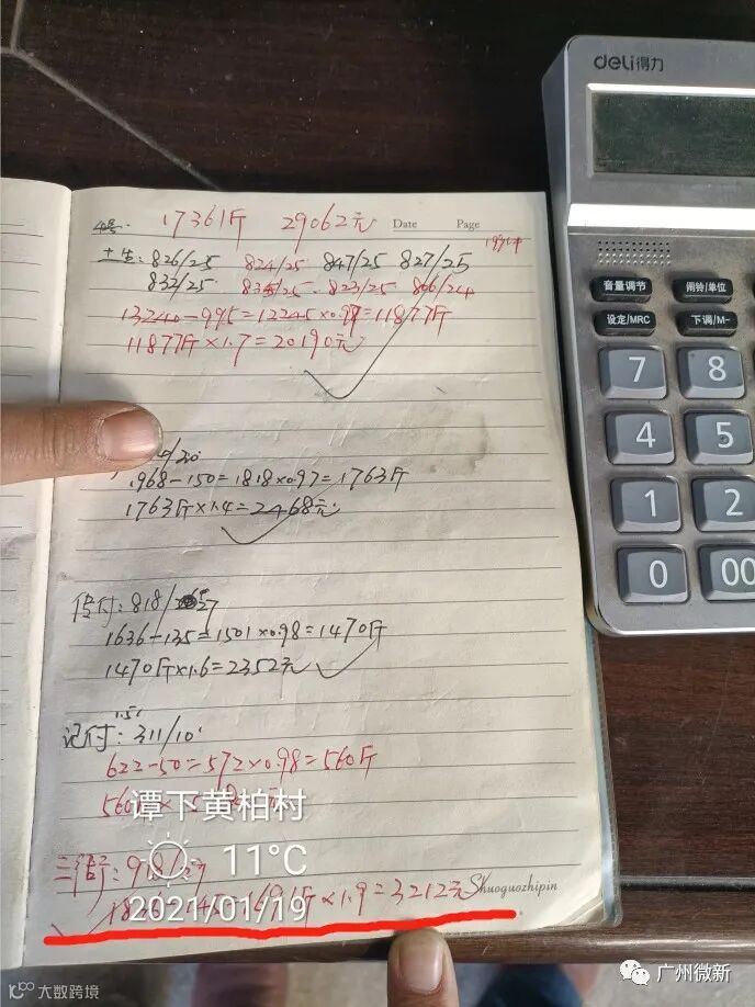蒋老板的卖果方式比较特别,除了有过一次2.5元订园之外,从2020年12月下旬到现在,他每天都自己剪果去卖百家果。而且特别“神奇”的是,无论行情如何波动,他的卖价都是1.9元(参见下面收购站的记录),而且他也不受行业潜规则“100斤扣2斤”的约束,称重多少就算多少,可谓创造了当地一个小小的卖果神话。