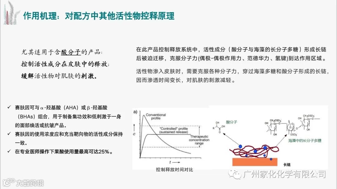 近年来,消费者对酸类产品表现出了极高的热情,酸类护肤品市场增长显著,酸类产品具有多样化的功效,能够有效改善消费者面临的各种油性肌肤问题。随着消费者对酸类产品的认知和了解不断提高,他们对酸类护肤市场也提出了更高效和低敏的需求。基于此,广州家化化学的石博士提供了一个缓解刷酸护肤的策略。通过独家水溶萃取工艺,成功提取了海藻中的硫酸化多糖,并将生物活性提升至50% 以上。可延缓酸性成分的释放速率,降低其刺激性,以求达到更佳的护肤效果。并得到了雅诗兰黛的认可,应用于旗下如海蓝之谜等高端品牌产品。此外,石博士还详细介绍了产品的作用机理,并通过测试验证了其效果。