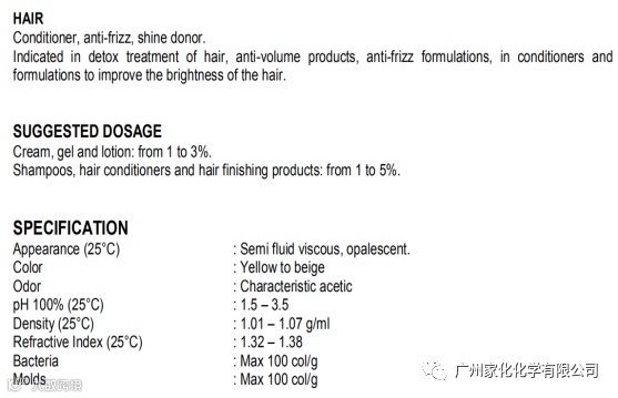 使细胞再生活性正常化。具有保湿性,吸湿保水。还能维持头发纤维的完整性,起到抗氧化的作用。
