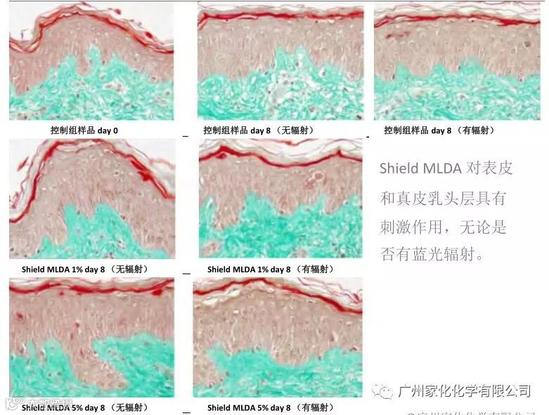 分析:Shield MLDA 对表皮和真皮乳头层具有刺激作用,无论是否有蓝光辐射。