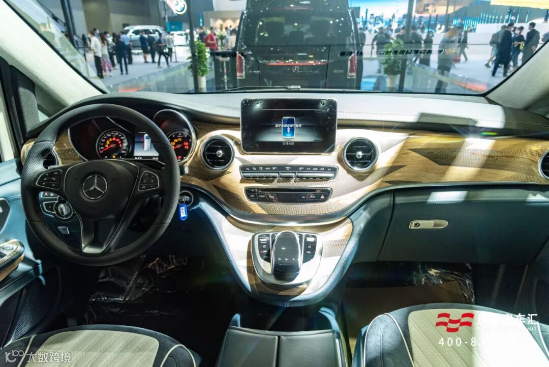 那接下来我们看一下这款奔驰V260L的驾驶舱,中控做了一个全新的钢琴烤漆的饰板,整体搭配米蓝的配色还是很漂亮的。