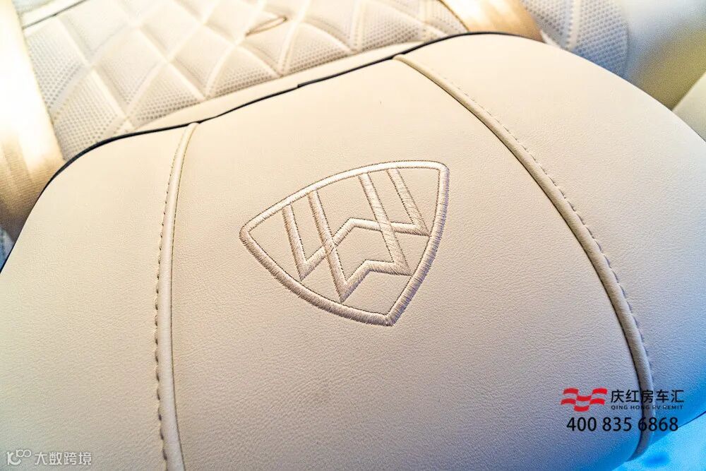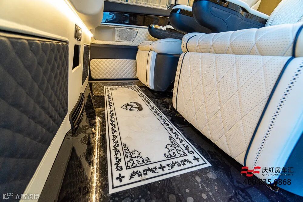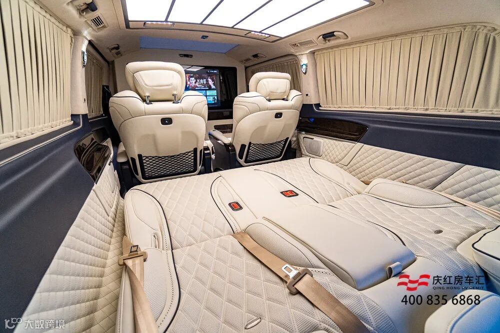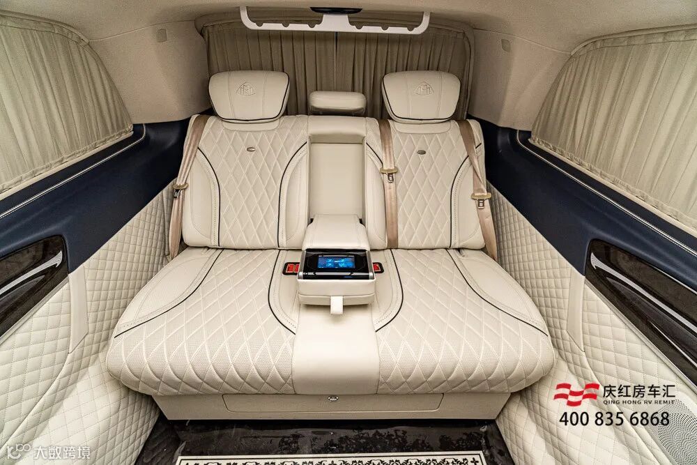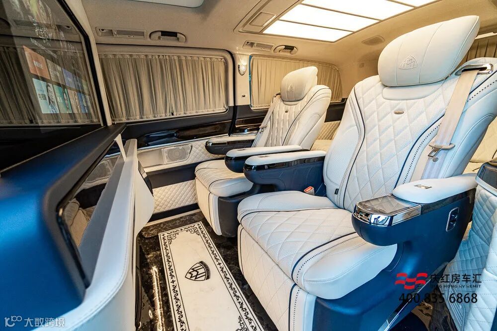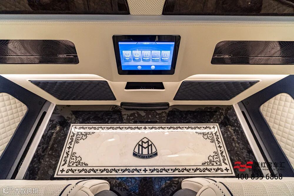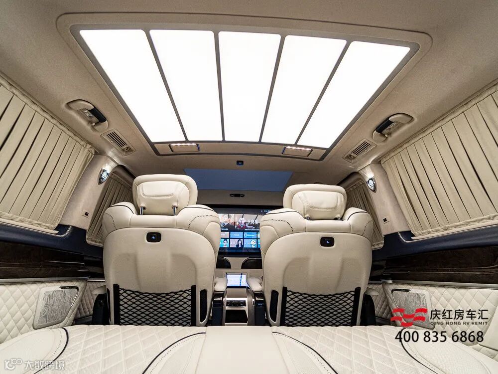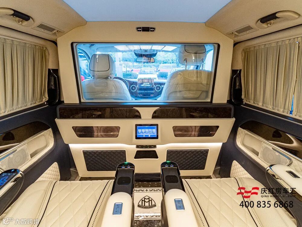 奔驰VS680全隔断7座内舱格局,后舱2+3座,隔断处设计32寸可升降液晶电视,并且设计雾化升降玻璃,一来可以保证前后舱相对独立性,保证后舱的私密性;其次如果想要与驾驶舱交流对话,也可以直接升降电视跟雾化玻璃。