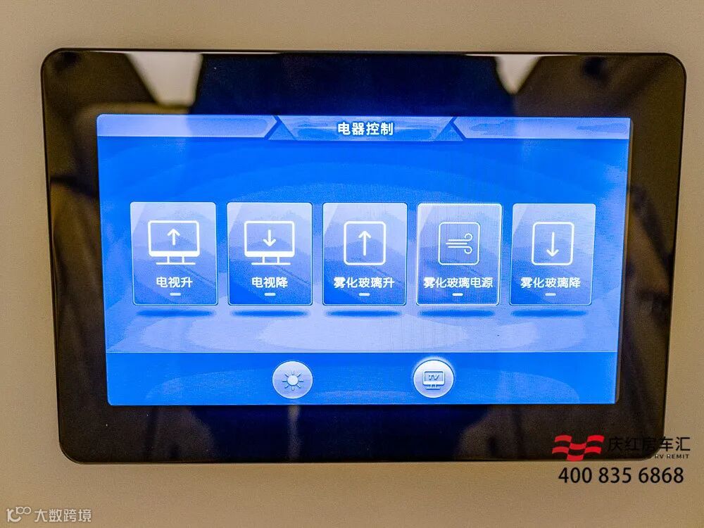 吧台中部配置的是轻触式的液晶控制屏,可以控制舱内电视、雾化玻璃、灯光等电器设备,图文结合显示,很实用。