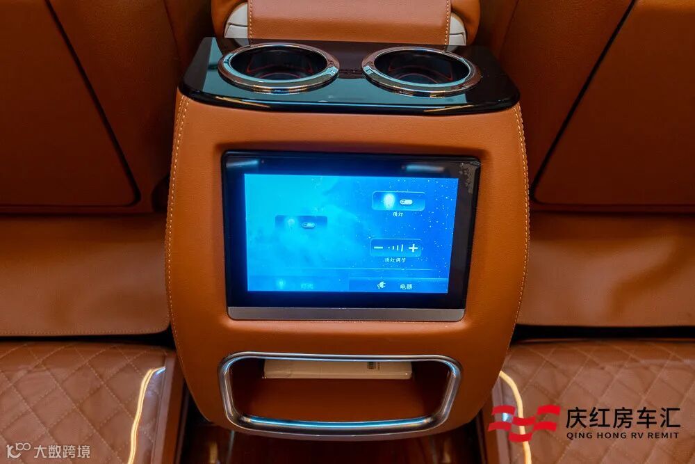 下方设计的是触摸控制屏,能够控制车内的电视、音响、灯光等电器设备,非常方便。