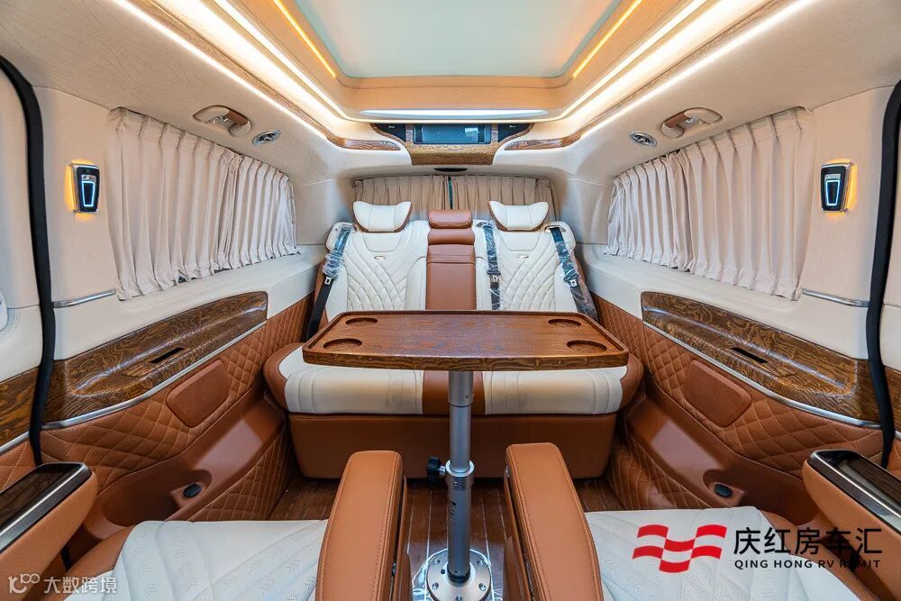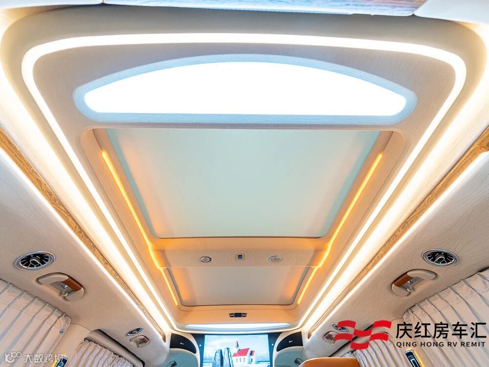 奔驰商务车V260L定制的内舱也相当不错,橙白的色系搭配活力十足,柚木地板、私密窗帘、超大全景天窗以及氛围灯,适量的岑木装饰,豪华感质感到位!