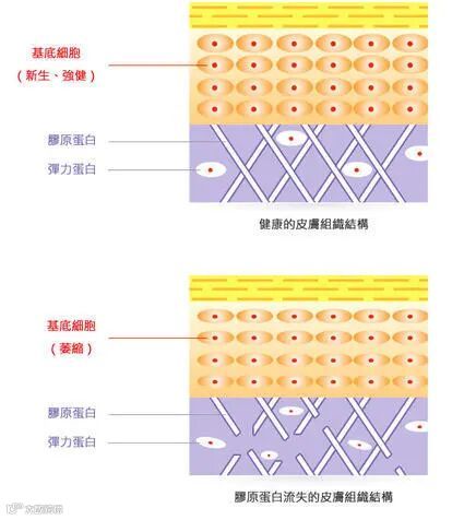 随着胶原蛋白的流失,真皮的纤维断裂、脂肪萎缩、汗腺及皮脂腺分泌减少,使皮肤出现色斑、皱纹等一系列老化现象。