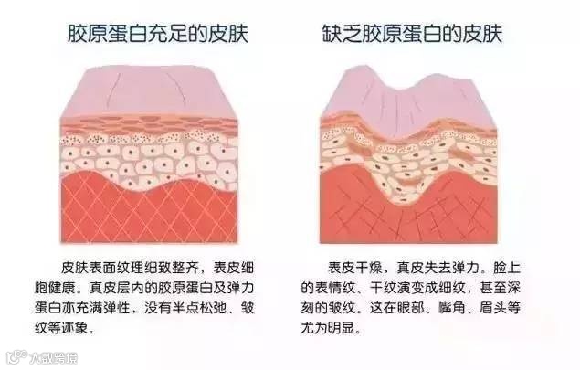 若皮肤中缺乏胶原蛋白,胶原纤维就会发生固化,使细胞间粘多糖减少,皮肤便会失去柔软、弹性和光泽,发生老化,继而出现松弛和皱纹。