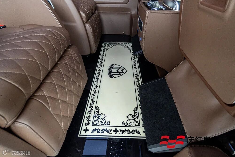 仔细点的老板还能发现,车内迈巴赫的相关元素也很多,比如登车踏板、一体式的印花地板、迎宾灯以及车尾处衣架等,细节之处印证威霆改装商务车的豪华感。