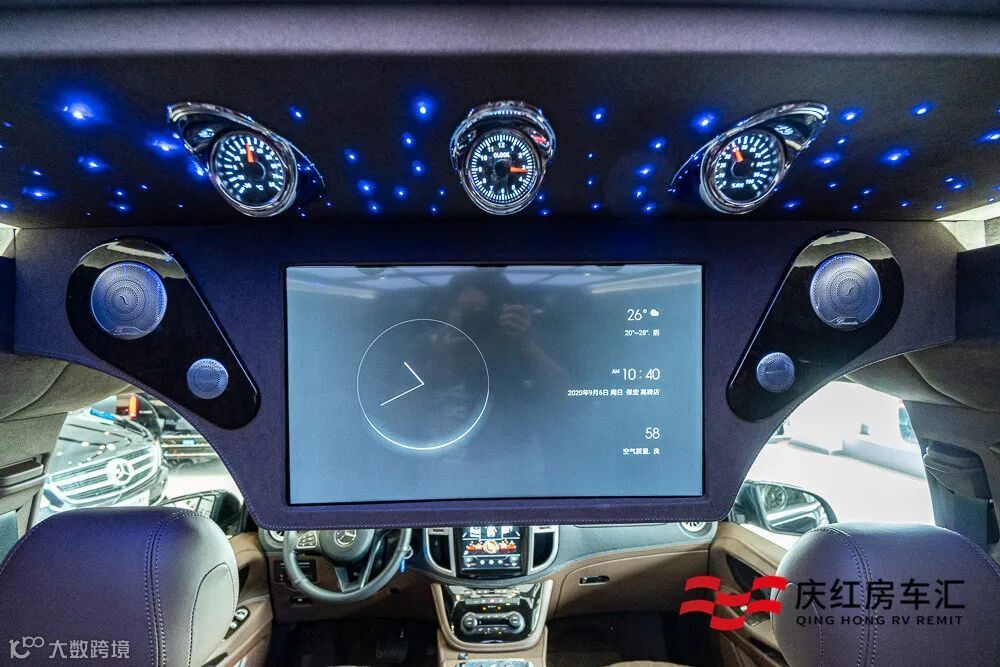 顶棚的宫格灯也是威霆改装的一大亮点,顶灯周边加以星星灯的装饰,延伸至迈巴赫式领袖钟表,豪华的氛围烘托得很到位!