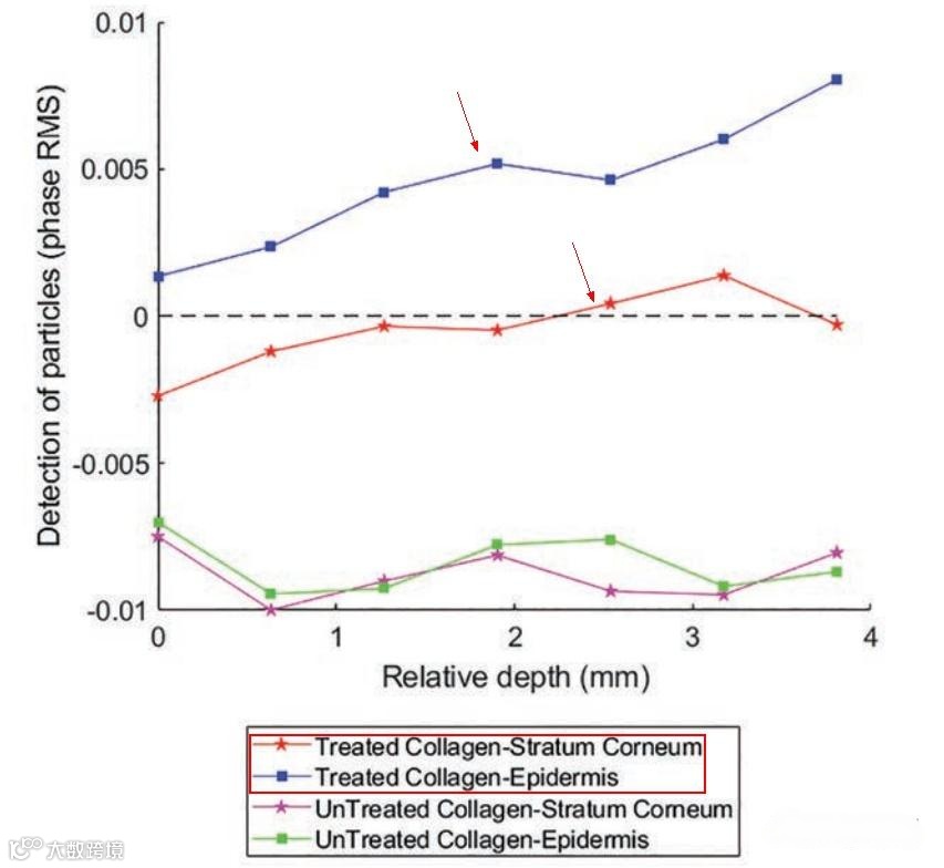 图1 IMOPE测试显示微粒化胶原可以透过角质层,未处理的胶原纤维不能穿透皮肤(引用自文献[3])