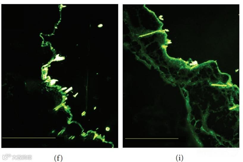 图2 果酸处理过的皮肤(i)胶原的渗透量显示高于未处理过的皮肤(f):绿色荧光代表胶原(引自文献[4])
