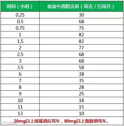 结论:饮啤酒两瓶或白酒2两(测试用白酒为38度),至少13小时以后再开车上路。