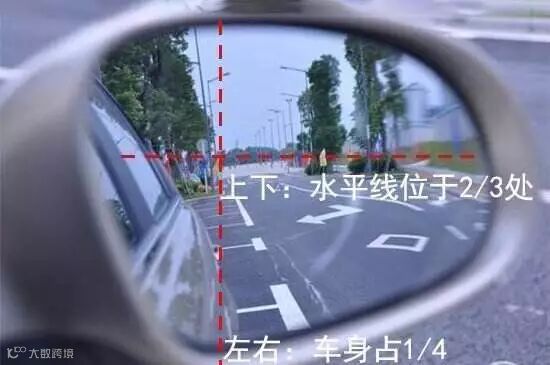 因为驾驶座位于左侧,因此驾驶人对车右侧情况的掌握不是那么容易,再加上有时路边停车的需要,右侧后视镜在调整上、下位置时地面面积应留得较大,约占镜面的2/3。而至于左右位置,则同样调整到车身占1/4镜面面积即可。