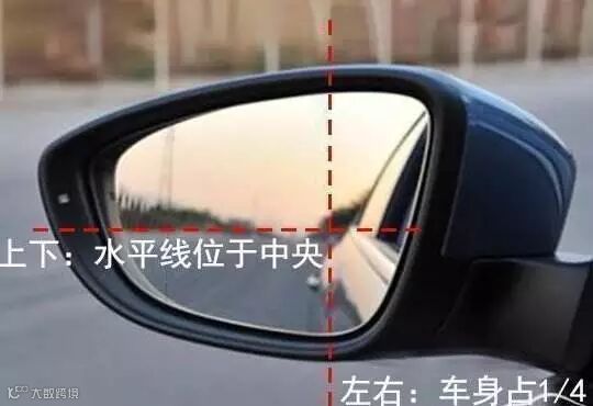 左、右位置调整到镜面的左侧边缘正好切至自己在镜中影像的右耳际,这表示,在一般的驾驶情况下,从中央后视镜里是看不到自己的,而上、下位置则是把远处的地平线置于镜面中央即可。