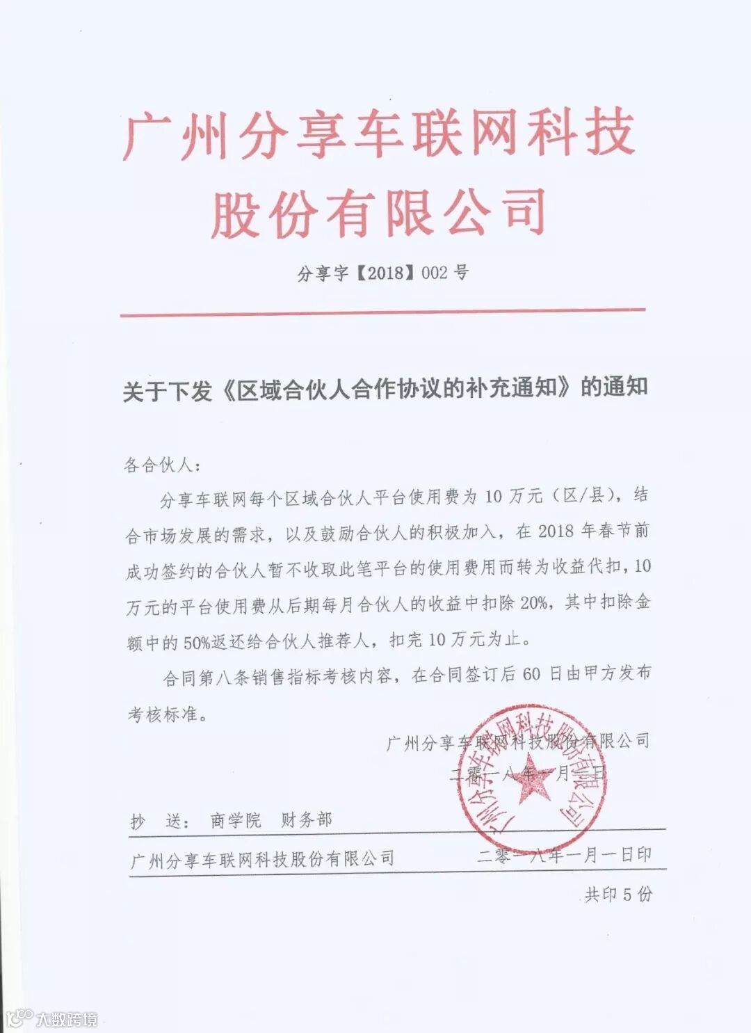 分享车联网每个区域合伙人平台使用费为10万元(区/县),结合市场发展的需求,以及鼓励合伙人的积极加入,在2018年春节前成功签约的合伙人暂不收取此笔平台的使用费用而转为收益代扣,10万元的平台使用费从后期每月合伙人的收益中扣除20%,其中扣除金额中的50%返还给合伙人推荐人,扣完10万元为止。