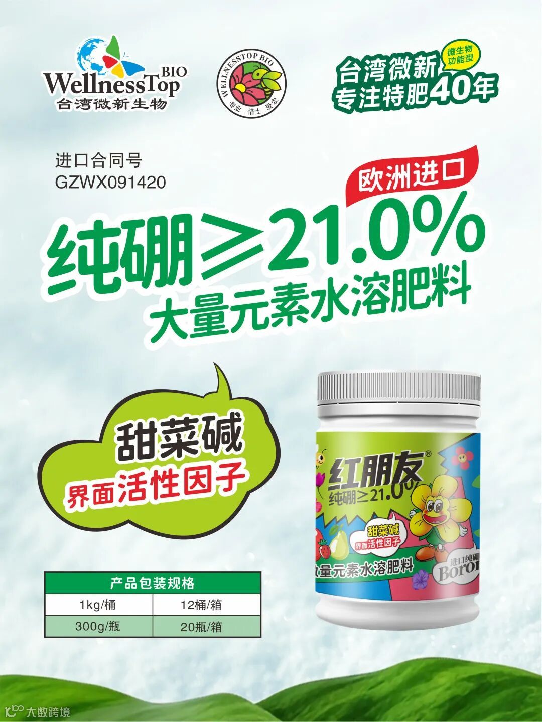 欧洲进口纯硼:B≥21.0%,全水溶无残渣,用量少,利用率高,水溶性好,即使在冷水中也能完全溶解;