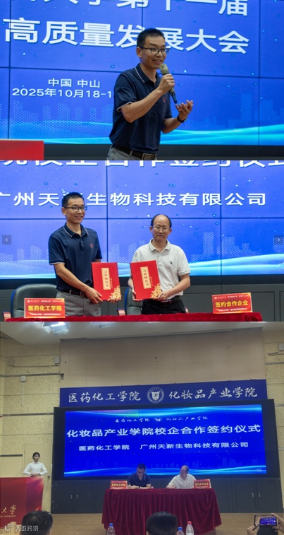 会议期间,一项具有里程碑意义的合作正式启动——广州天新生物科技有限公司与广东药科大学医药化工学院现场签署了“共建化妆品产业学院”战略合作协议。此举标志着双方将携手在协同育人、科研攻关与成果转化方面展开深度绑定。