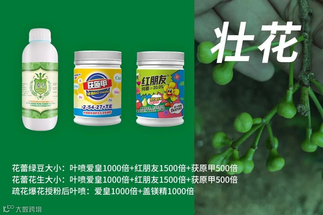 根据花蕾多少的程度,最好是未喷施前进行疏花。爆花授粉后叶喷:爱皇1000倍+盖镁精1000倍