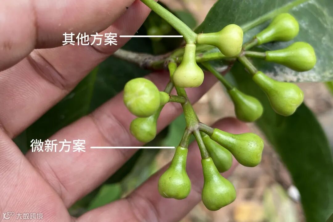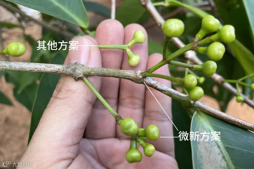 海南文昌迈文昌迈号莲雾果园11月4日回访,从控梢催花保果全程使用微新方案,与其他果园对比,果柄粗,花壮深绿色。果形漂亮,后期更容易保果。回访人:刘强勇.