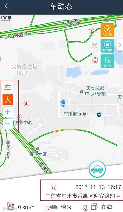 7) 熄火/启动:显示车辆属于启动或者熄火状态并进行推送提醒;