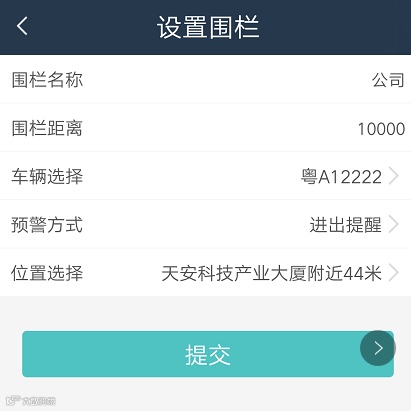 该界面是对围栏名称,距离,车辆,以及预警方式和位置的选择设定。