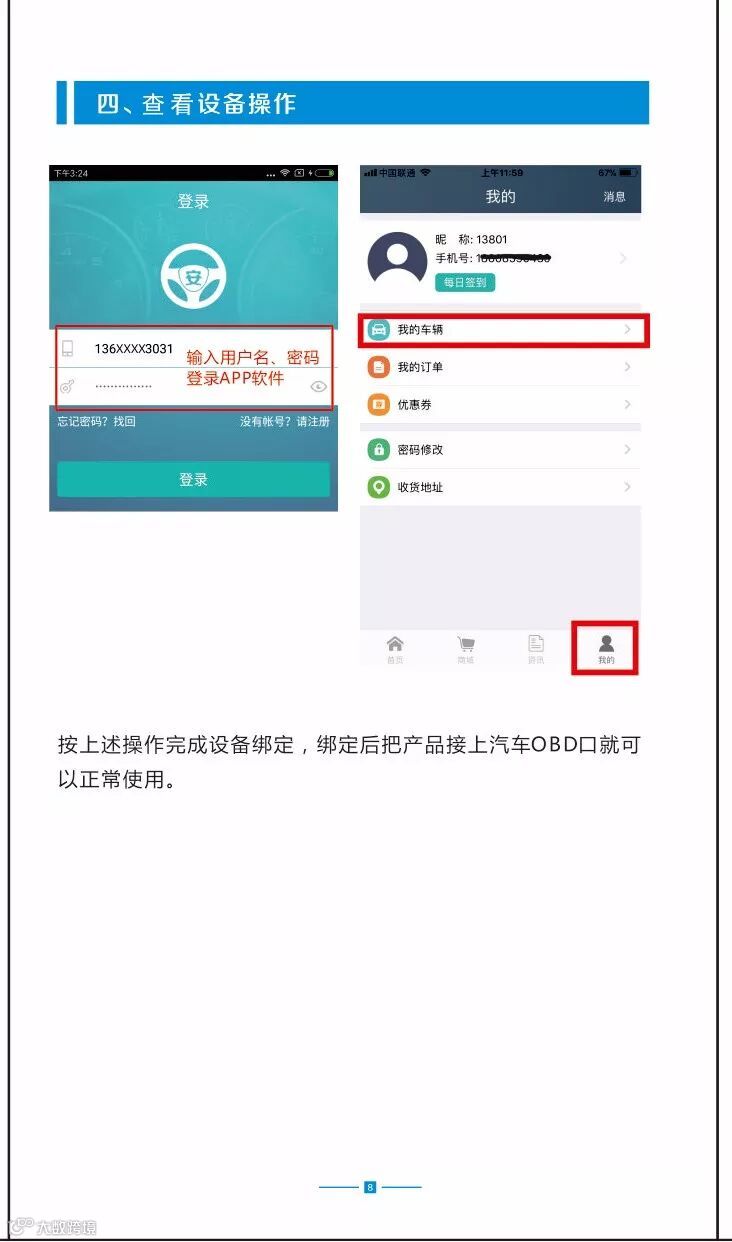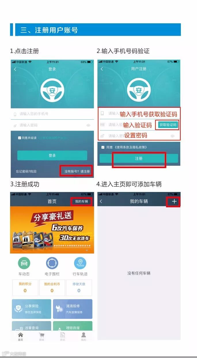 在汽车上安装分享车联网OBD,下载“安行无忧”APP后,按平台指引取得账号及密码后并绑定车辆,即可通过OBD对车辆停驶以及行驶状态进行数据采集和记录并在APP上显示。