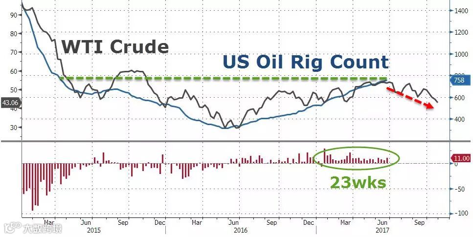 据金融博客Zerohedge观察,鉴于油价和石油钻井机数变动的滞后关系,随着油价跌至年内低位,美国未来几个月的石油钻井机增幅将呈放缓甚至是回落的趋势。
