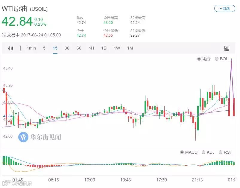 数据公布后,WTI原油期货短线从43美元/桶上方回撤,报42.77美元/桶,日内涨幅从0.9%收窄至0.1%。布伦特原油期货涨幅也收窄至0.3%,徘徊于45.40美元/桶左右。