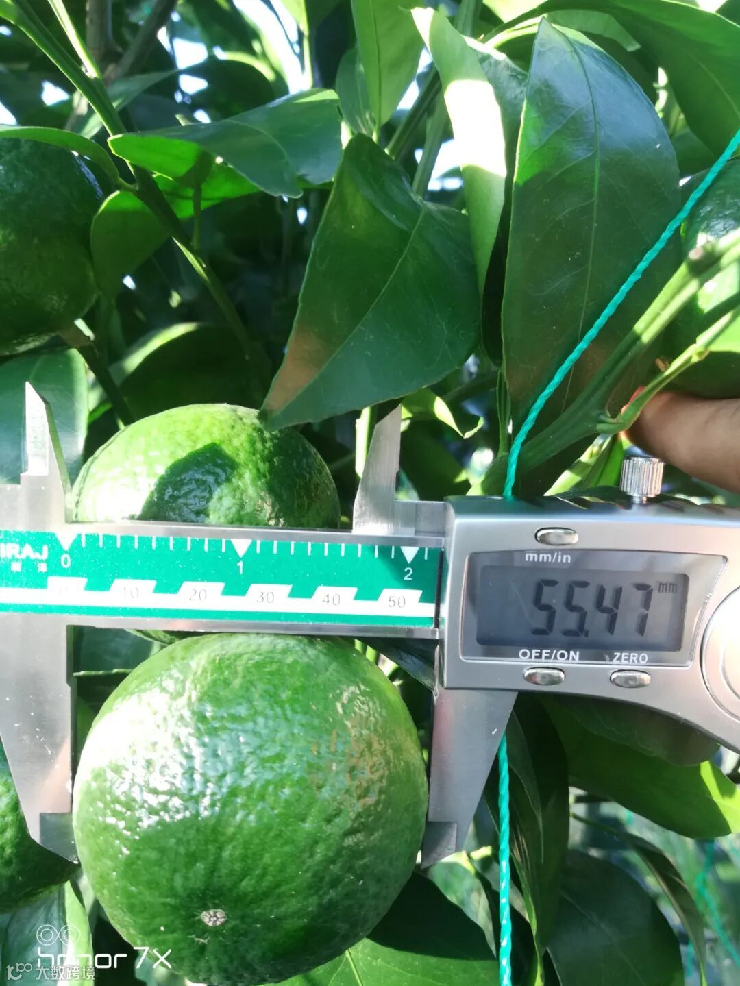 果园从2019年8月开始用我们的产品,随后成为微新生物全程管理的果园,而负责提供技术服务的,便是我们的陆原胆老师。经过一年的精心管理,目前果园树势很好,果子也非常大个。据我们8月11日实测,果子直径绝大部分都在50毫米以上。果子大小也非常均匀,避免了种沃柑最忌讳的大小不均匀的问题,而且没有花皮果,所以商品价值比较高。