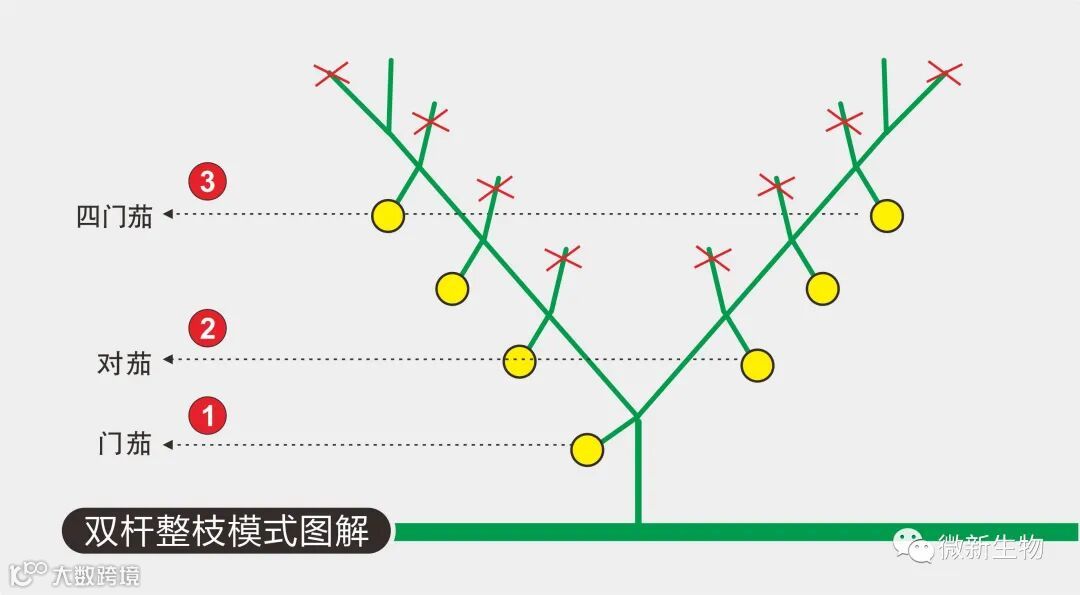 茄子适合双杆整枝,当对茄的花开放之后,每个头顶都会另外出一个侧枝,主头和侧枝,哪个好留下哪个,一棵茄子上只留下两个头,茄子往上继续生长时,也只需要控制两个头即可,无需增加其他生长点。