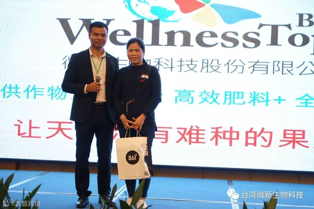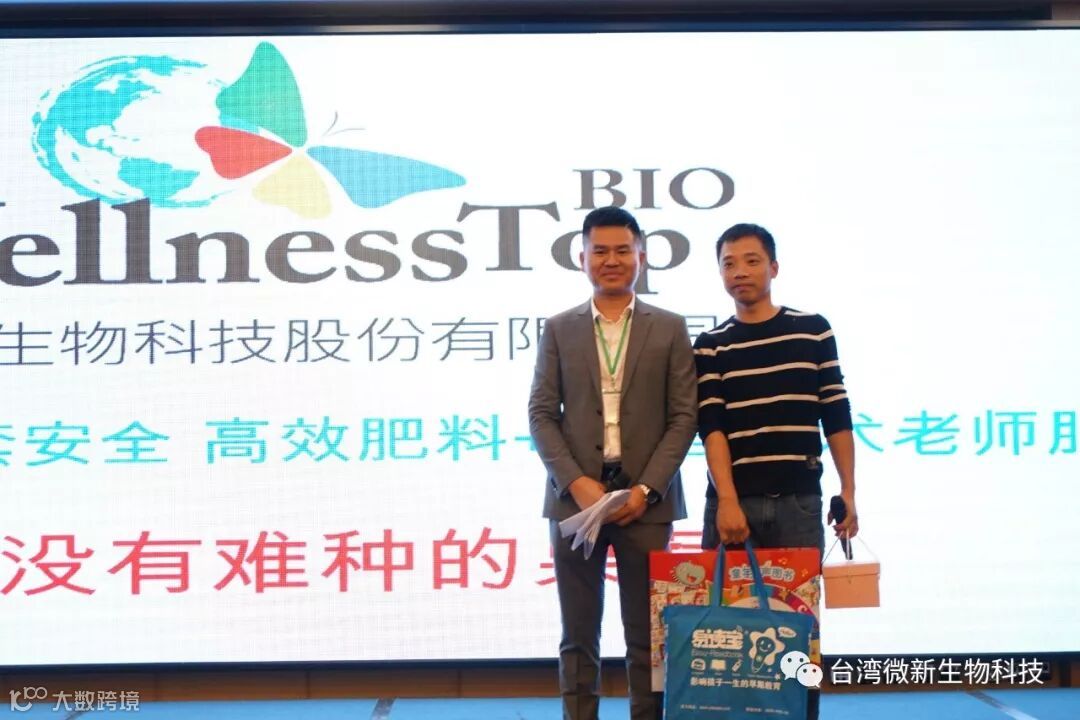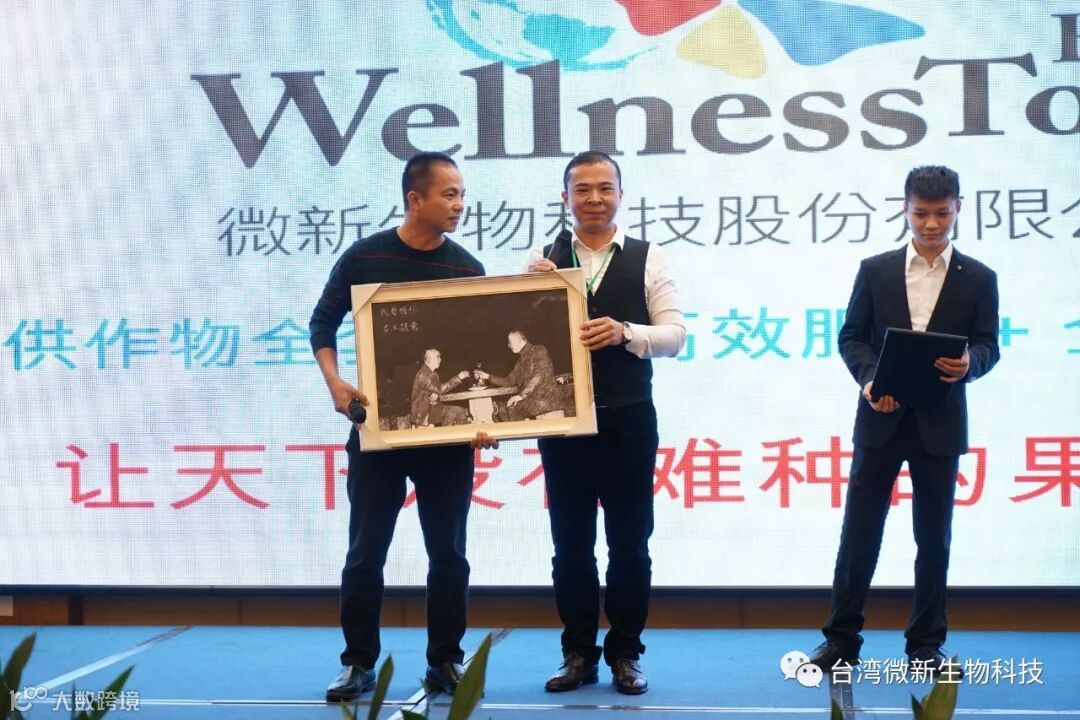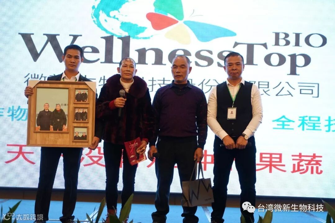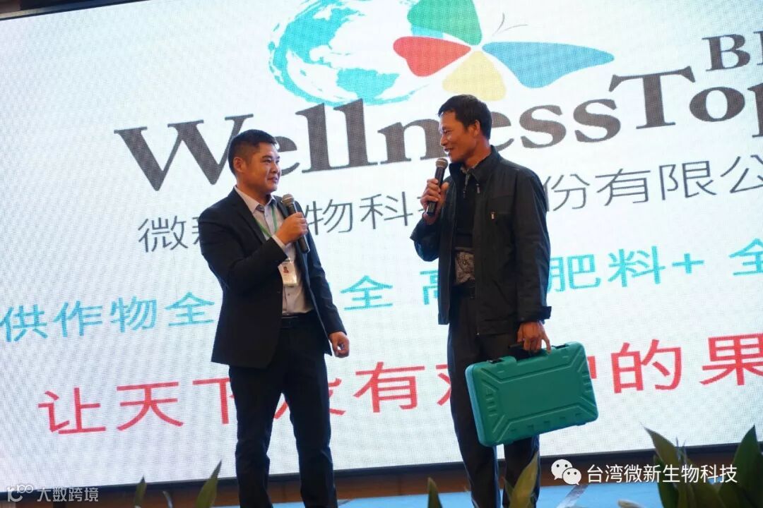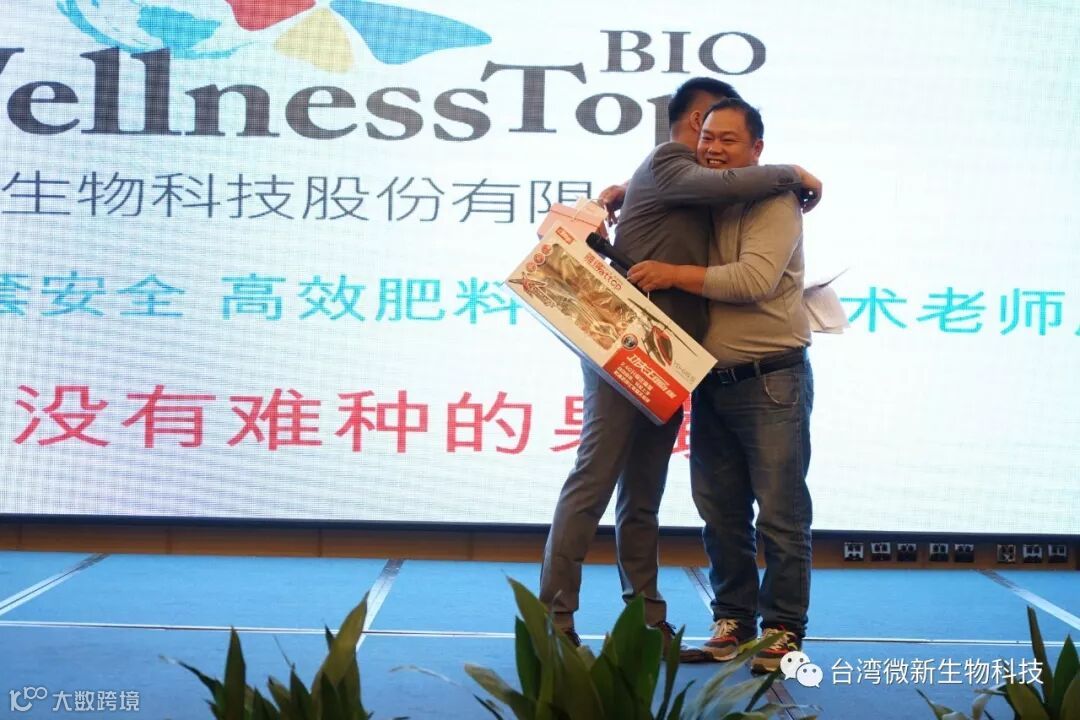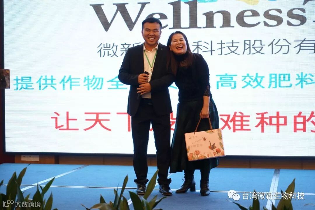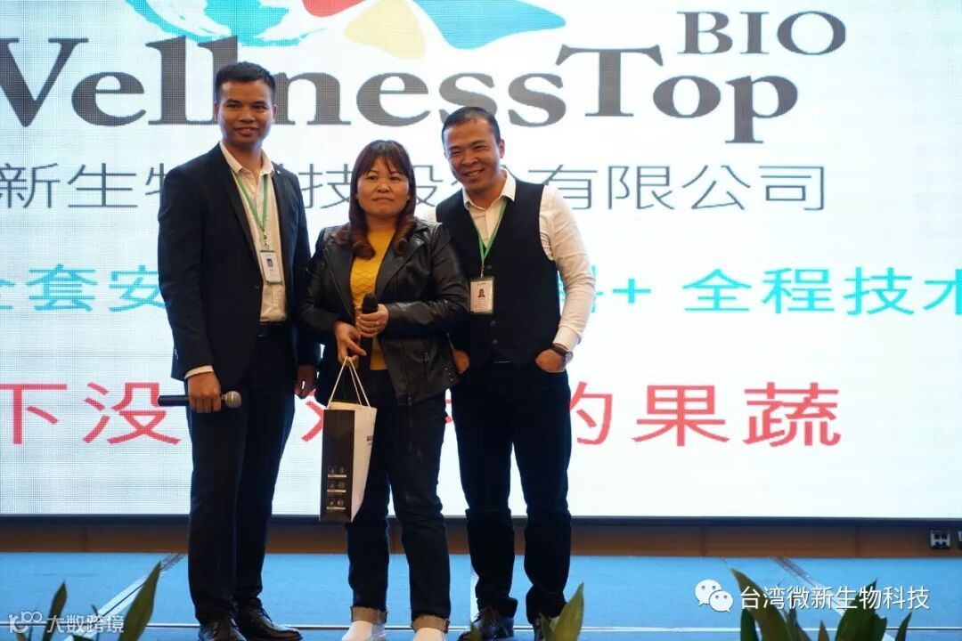 潘老师的感言;我非常的感谢廖涌杰夫妇,对微新生物的支持,他们是我在象州下乡开发市场的第一个客户,打造出来的第一个观摩园,每天在气温高达37~38℃环境下做示范实验,我一吃饱中午饭我就拉廖老板下乡,他都向王总诉苦说:“你的潘总都不给我小眯一会儿就要拉我下乡去了”。廖老板的鞋都被我磨烂了几双,人晒成了别人眼里“你是烧炭的还是出瑶,他的客户都亲切的称呼他为“廖黑子”了,有一次刚下完大雨我们下乡去陆来丰的果园。车差不多到果园时陷进了泥坑,我想一脚油门冲出来,却磨破了轮胎,轮子都漏气完了,当你看到我的一脸的沮丧,你对我说,潘总不急这个我来弄,在这个烂泥坑里,你三下两下就把车轮换好,还有很多让我很感动的事迹太多了,让我今天在台上不叙说太多,你看巫蒙燕女士从一个只是从只坐店的老娘,来了一个人生的180度大转弯变成了早出晚归,风里来雨里去的为果农把关守护的植物医生,借这次机会向廖涌杰先生跟巫蒙燕女士深深的表达我的欠意。