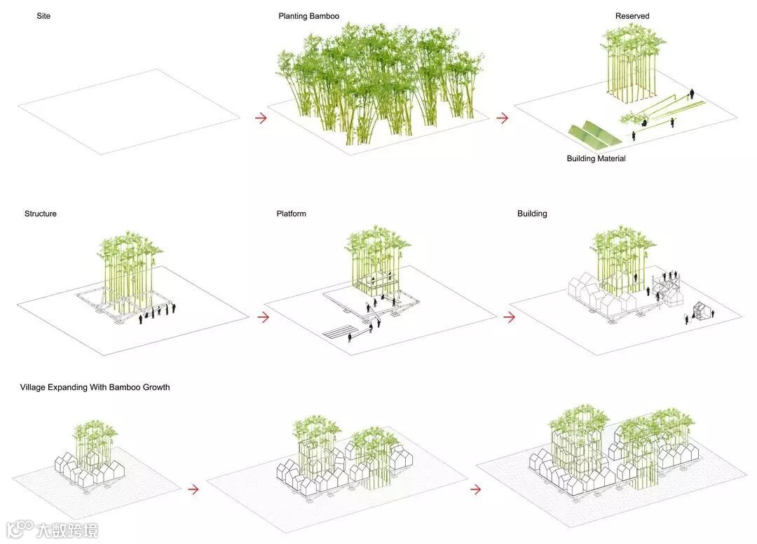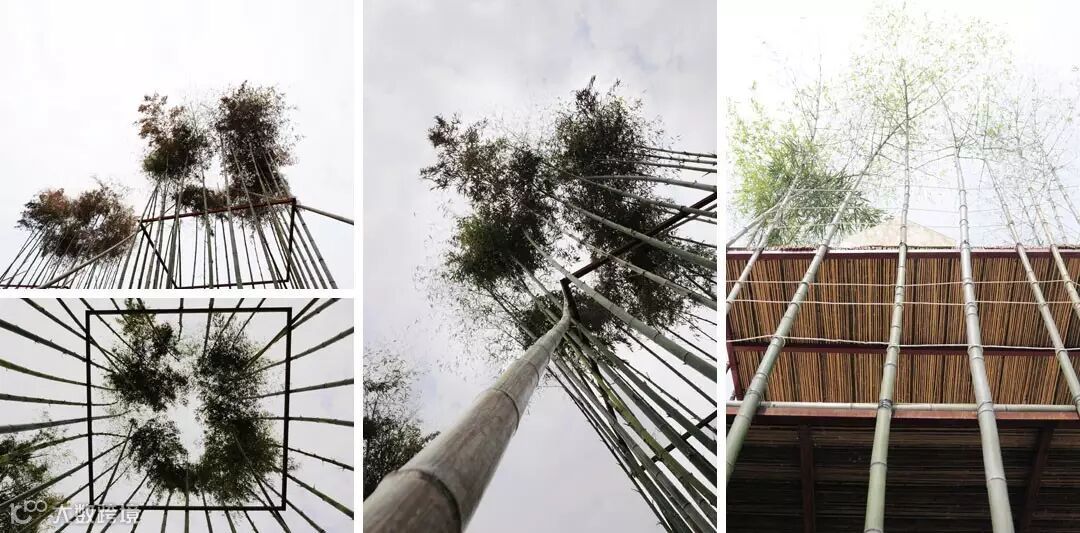 竹子是天才的结构材料,将活竹移栽成两个3米*3米*8米的房子,通过横向构件固定在一起,作为空中露台和儿童活动室,同时竹子也是整个建筑景观的一部分。用原竹作为建筑的主体结构,建筑被拆分成8个3米*3米的原竹结构单元,通过3平米的基础面积获得90平米的建筑面积,底层倒金字塔形的结构让孩子们的房子悬浮在空中,两个种植的建筑作为城市向上的空间原型。每个孩子建造自己的小房子,许多个房子在一起经营出带有邻里关系的城市空间形态。