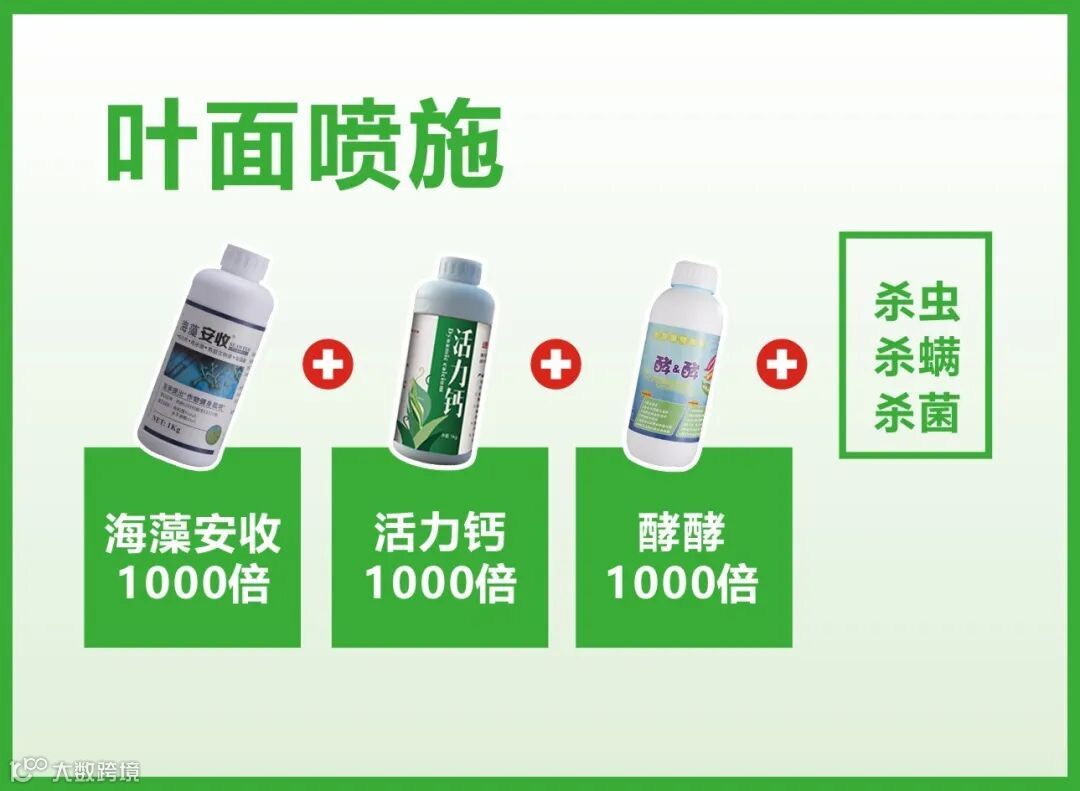 叶面喷施:海藻安收1000倍+活力钙1000倍+酵酵1000倍+杀虫、杀螨、杀菌