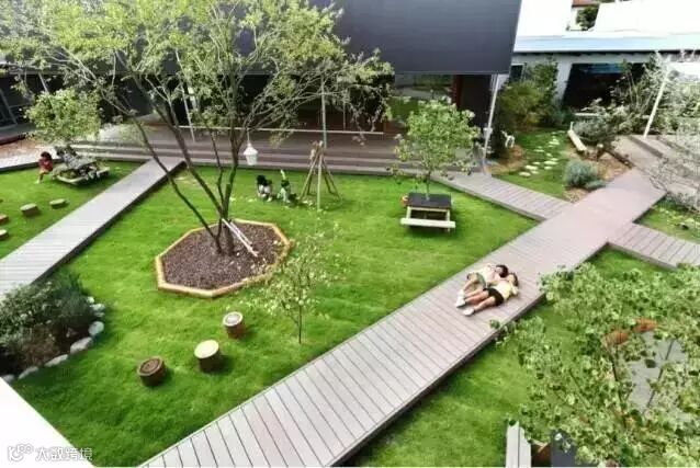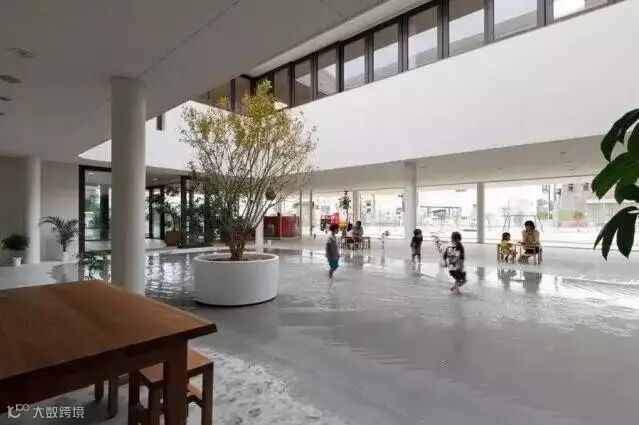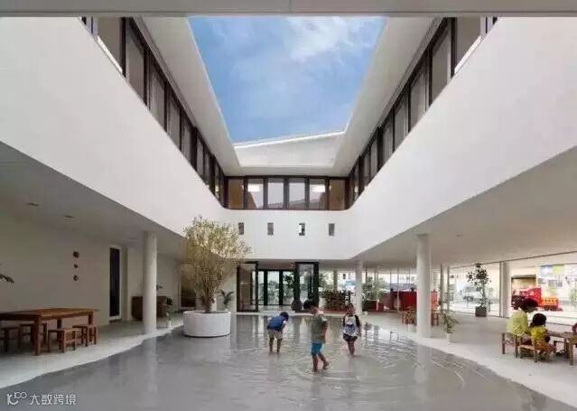 △中庭采用了开放式的屋顶,下雨后孩子们就可以踩水玩了。