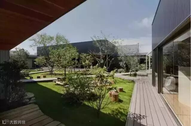 中央庭院的走道向四面八方展看,孩子们在这里可以观测植物、嬉戏休息,与大自然亲密接触。另外,儿童洗手间的设计也值得一提。宽敞的落地玻璃面朝着庭院,光线充沛,给室内明亮整洁的印象。