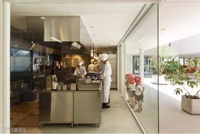 △饭堂也连接着室外,有野餐的感觉。孩子们还能从开放式厨房看到做菜的全程。