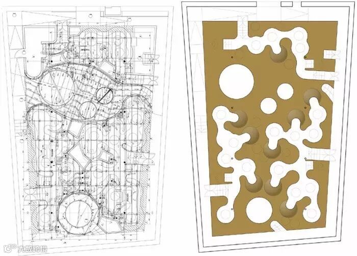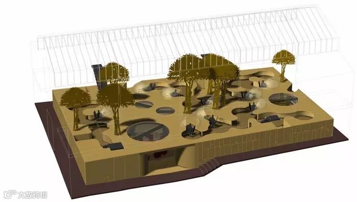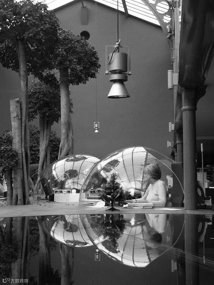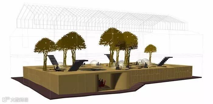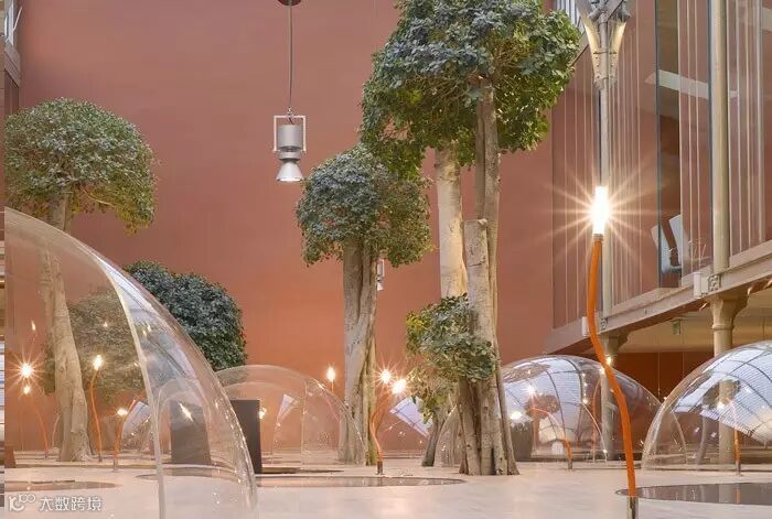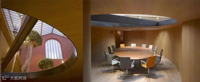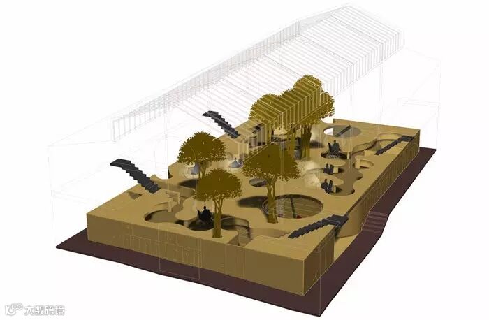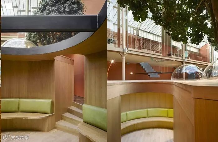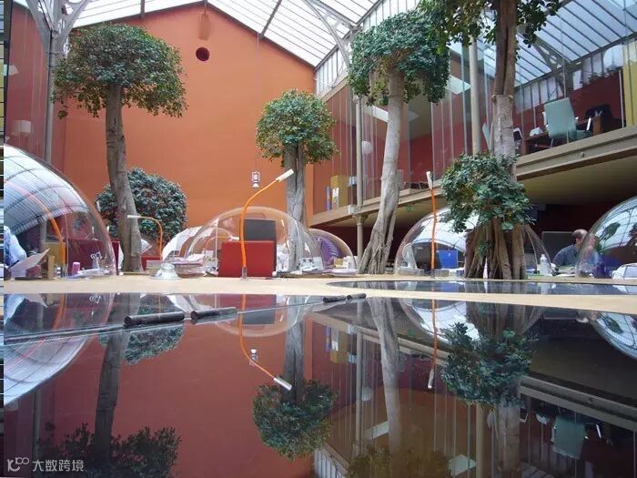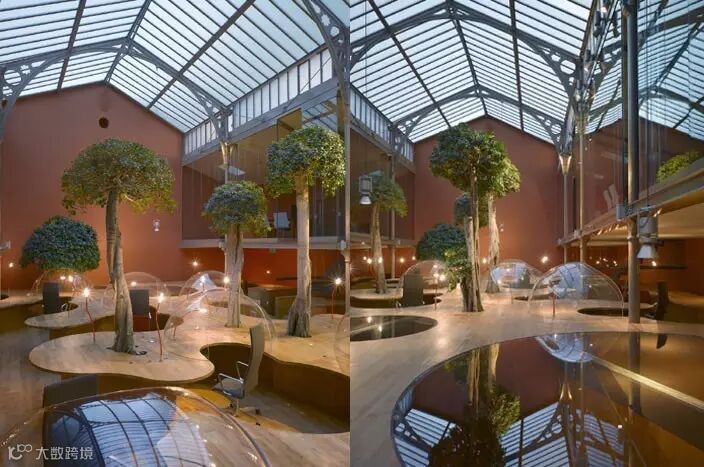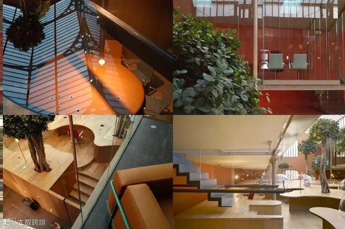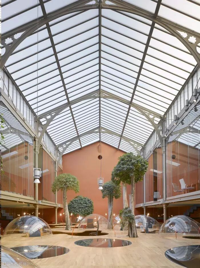 原来的建筑是一个19世纪的工业建筑,顶上是巨大的钢框架。公共大厅已经完全改建,安装上自洁玻璃屋顶。在其间设置了一个巨大的木质平台,这个平台层有三个意义:桌面,天花板,地面。大平台是8名办公人员的桌面,在办公人员坐的位置还设置了树脂壳体。平台也是会议室,娱乐室和厕所的天花板,在会议室里面,设置了开洞带来充足的自然光。平台上剩余的空间种植上了榕树,榕树穿透平台层迎向上方。大厅四周还设立了档案室、衣帽间和厨房。