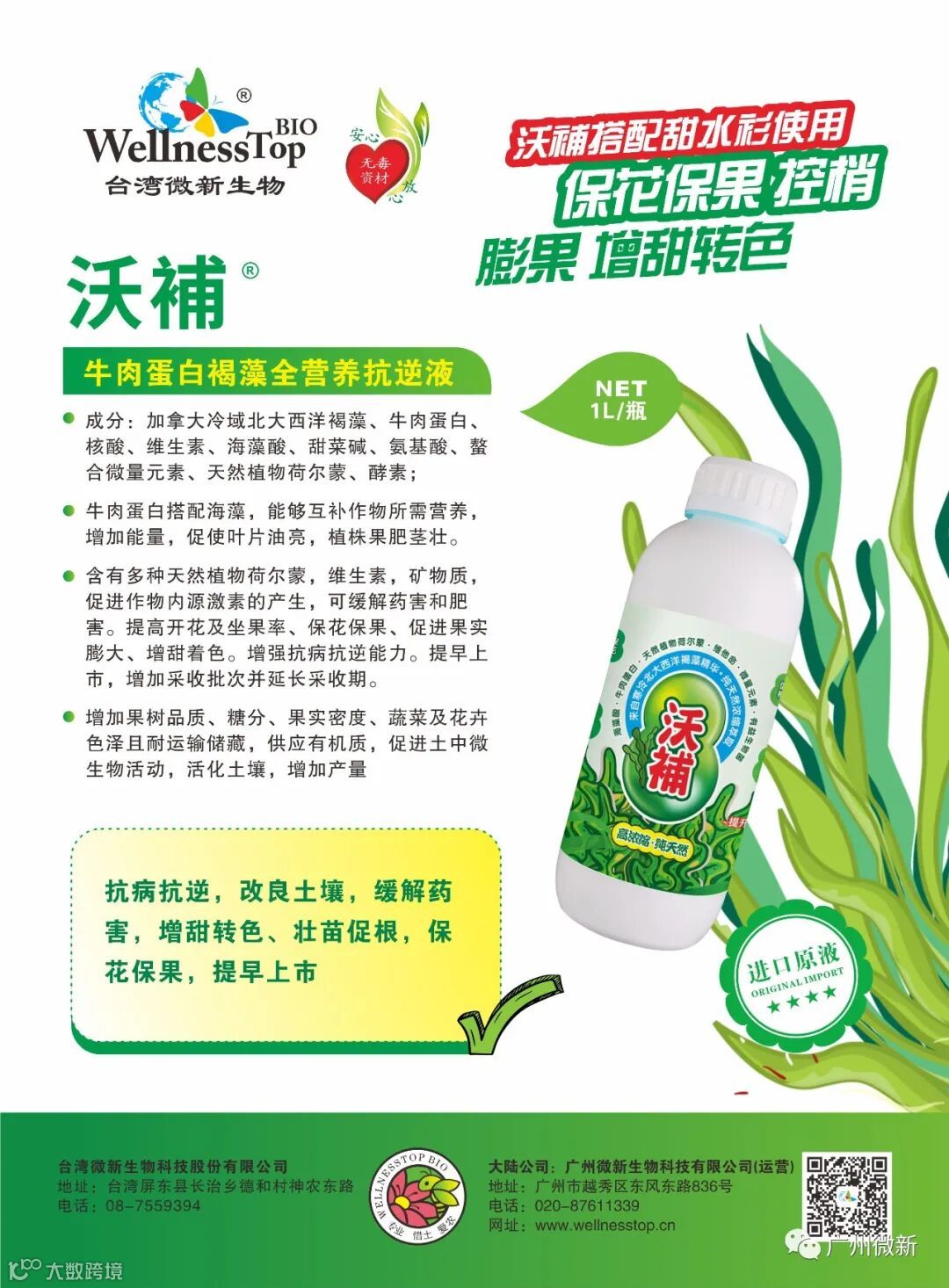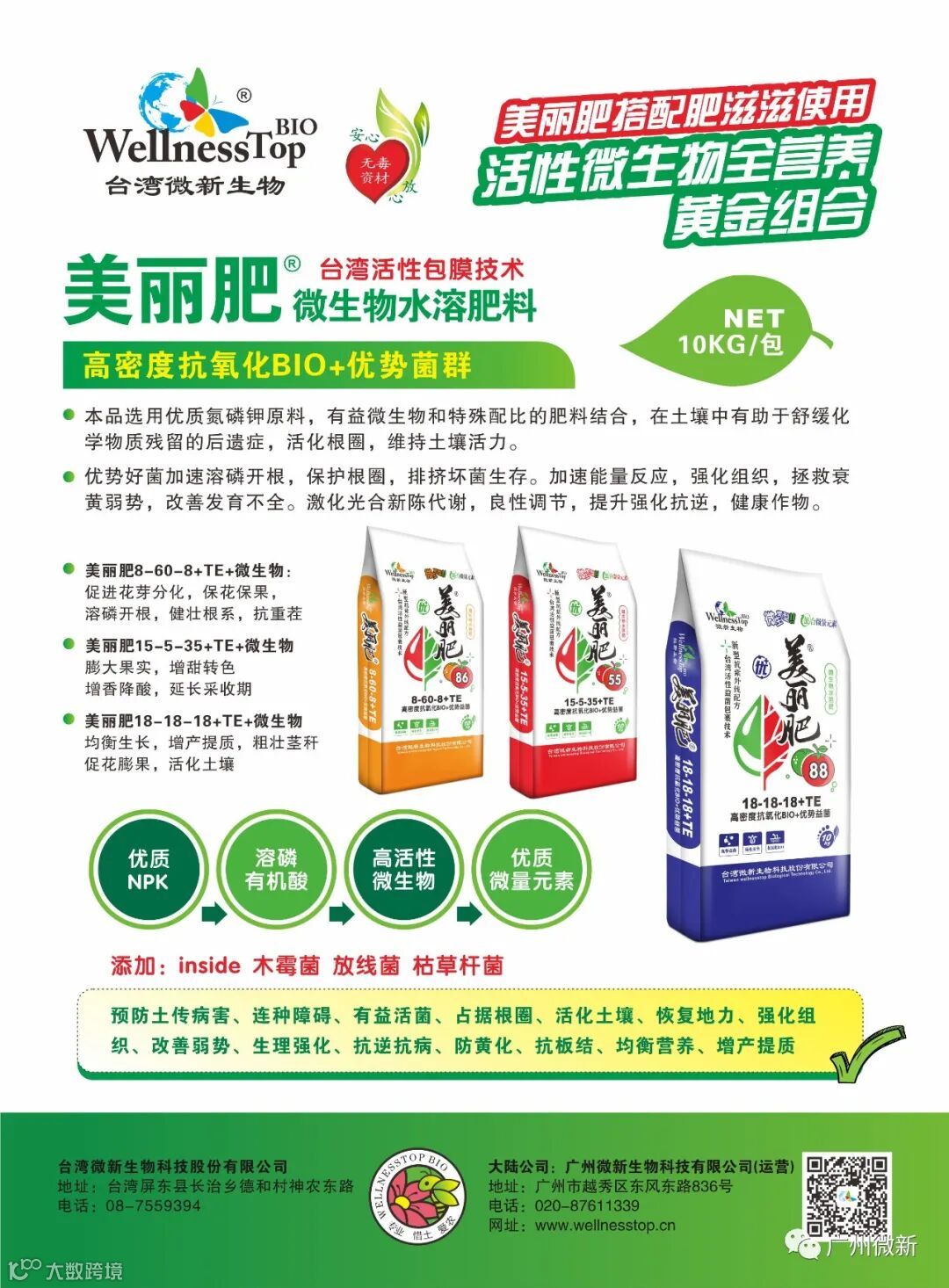 1、微新生物简介:台湾“微新生物”专注植物营养三十余年。公司专注微生物肥料、功能性肥料的研发和生产,为市场提供安全、高效、无公害的产品。同时改善传统肥料及化学农药不足,促进绿色安全农业发展,保护环境。