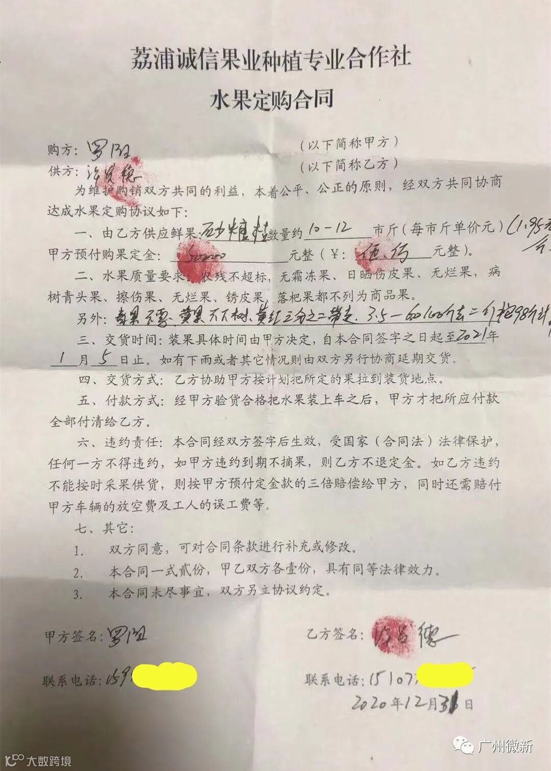 发哥这次卖果是1.95元一斤(见下图合同),还差5分钱就到2元了。根据农财网柑橘通统计的2021年1月2日砂糖橘行情,即使是好果,大部分价格也在1.2-1.8元之间,只有极少能到2元。所以发哥1.95元的卖价,已经跻身目前广西砂糖橘最高价之列了。