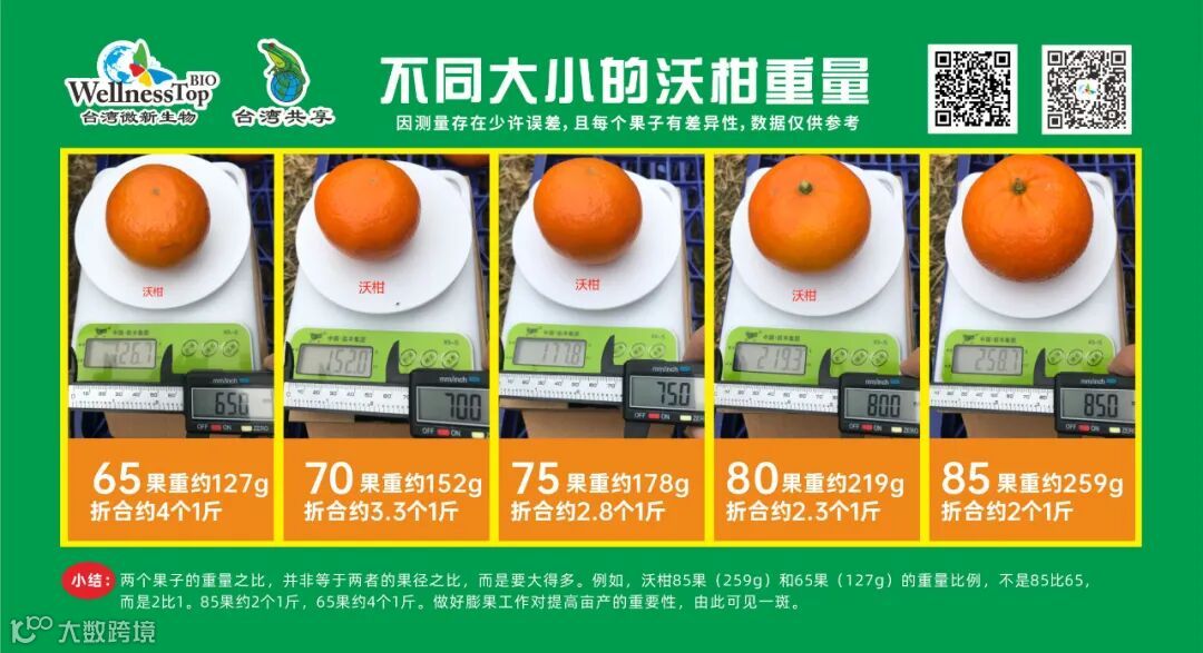 由上可知,果子大一点点,重量会重很多。例如,沃柑85果(259g)和65果(127g)的重量比例,不是85比65,而是2比1。85果2个1斤,65果4个1斤,所以后期膨果非常重要(当前,前期养分也要充足)。这也是高产量的来源之一。