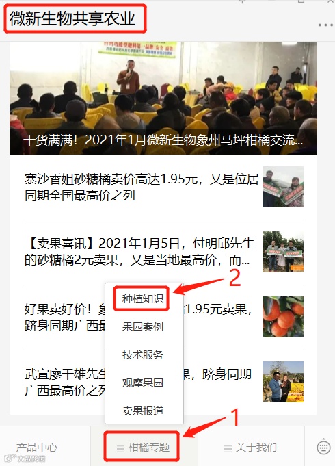 温馨提示:关注“微新生物共享农业”公众号,点击底部“柑橘专题”中的“种植知识”(见下图),可了解更多种植技术。